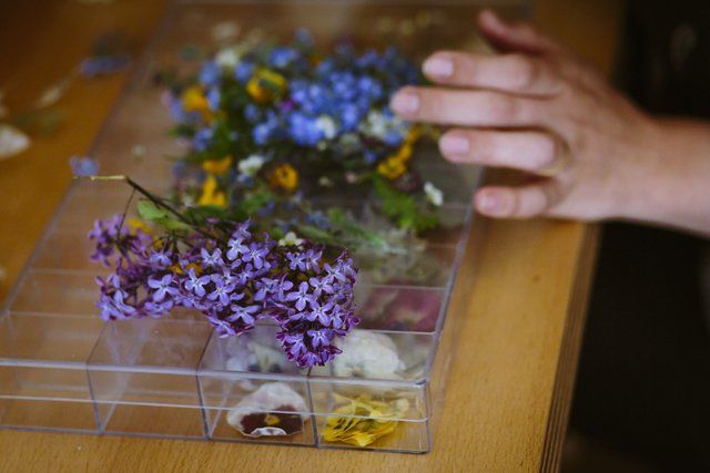 Viele Blumen und Pflanzen erfordern eine andere Technik. Ich trockne im Buch, in selbst gebauten Pressen und in Grieß (ja, in Grieß). Blumen verändern beim Pressen fast immer ihre Farbe. Lila verblasst häufig, weiß wird schnell braun. Je schneller Du Deinen Strauß in die Presse gibst, desto besser. Selbst gebaute Pressen brauchst Du nicht, deswegen beschränke ich mich auf das Buch und auf Grieß.